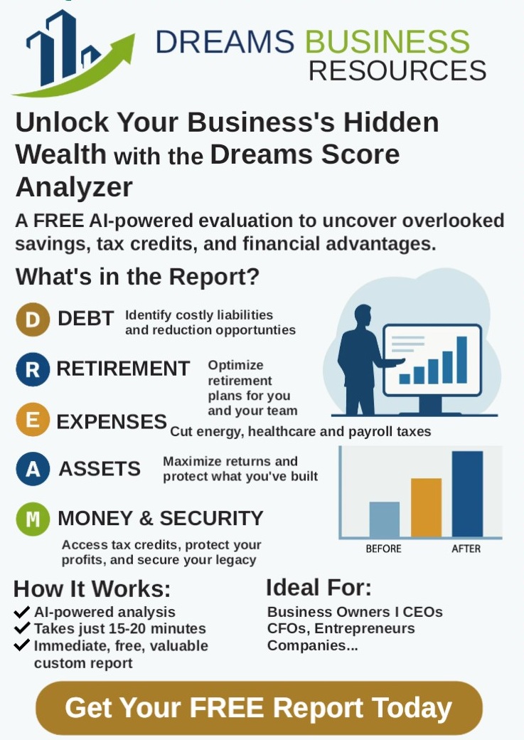 The DREAMS Score is our proprietary business assessment designed to help business owners uncover hidden savings, improve profitability, and plan for long-term success. In just 15 minutes, it identifies overlooked opportunities—often missed by CPAs or traditional advisors—across six key areas of your business.