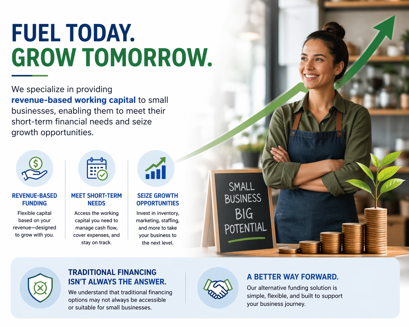 We specialize in providing revenue-based working capital to small businesses, enabling them to meet their short-term financial needs and seize growth opportunities. We understand that traditional financing options may not always be accessible or suitable for small businesses, which is why we offer this alternative funding solution.